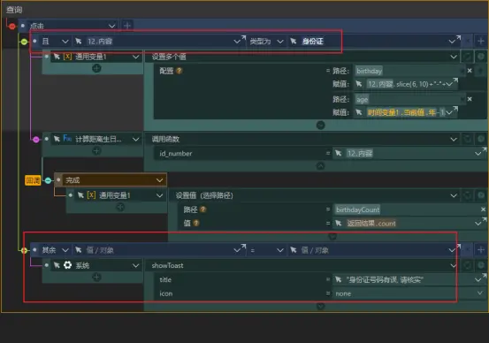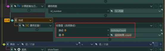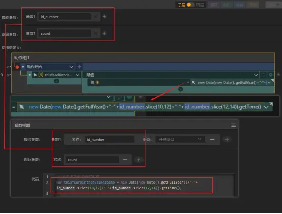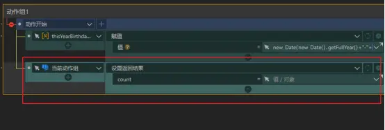 其实函数组件部分的内容也是可以写在一个动作组内的,yyyy-mm-dd格式日期就是一个字符串,可以用文本变量存储,而时间戳可以用数值变量存储,另外当前动作组设置返回结果的动作就类似于函数中的return,这里做了一个简单的示范,剩余部分大家可以自己尝试一下,最后是可以和函数组件一样调用并且在回调中拿到计算结果的。