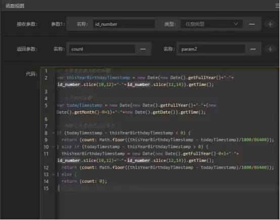 第三步则根据前面两个时间戳进行一个判断,如果当天日期的时间戳更小则说明用户今年还没有过生日,则直接用今年生日日期时间戳减去当天日期时间戳,然后将结果转换成以日为单位即可,反之则拼接出用户明年生日日期并获取时间戳再减去当当天日期时间戳进行计算。(demo中没有处理生日为闰年2月29号的情况,大家可以自行添加逻辑)