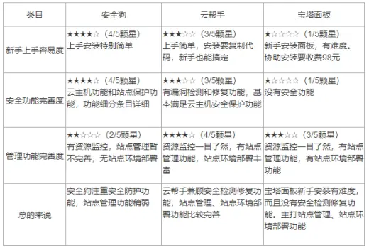 按照搜索热门和推荐程度对比的管理工具软件有:安全狗,云帮手,宝塔。 对比内容:新手上手难度对比,操作便捷性,站点管理,云主机检测,云主机修复,使用过程中不足和优势。