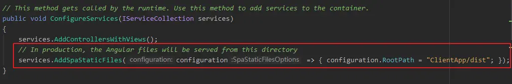 在项目的startup.cs中配置的spa的staticfile的路径是"ClientApp/dist"