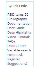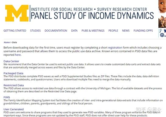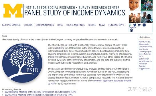 其网址为:https://psidonline.isr.umich.edu/default.aspx,下边就是主页的截图,上边介绍了PSID的情况,并强调数据可在此网站上获得,而研究人员和分析人员无需付费。数据被全球的研究人员,政策分析师和教师使用。 超过6,000种经过同行评审的出版物均基于PSID。 认识到数据的重要性,许多国家创建了自己的类似于PSID的研究,现在可以促进跨国比较研究。