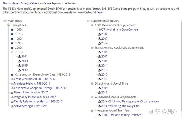 1968年时,参与调查的有4800个家庭,而到2001年时,这个数目已经增加到7000个。PSID追踪了65000个个人在36年间的生活和各类经济活动。PSID基本上两年调查一次(这是我个人从网站获得的信息,如有不准确还请见谅),目前主要的调查数据已经更新到2017年,每年都会有新的调查样本加入进来,同时也会启动一些新的调查项目,如消费支出、儿童发展、婚姻历史等等。