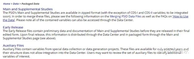 其中,Data Center是PSID的数据中心,它是一些高级的数据搜索、列表与使用、存储等功能,比如可以通过Variable Search来搜索所需的不同年度不同调查项目的数据,但是对于我们来说,对PSID的数据完全不熟悉,小白很难使用这些功能,而且国内访问这个网站速度很慢,搜索的时候网页经常在“转圈”,还不如直接把数据下载下来自己去筛选,所以接下来还是直奔主题。