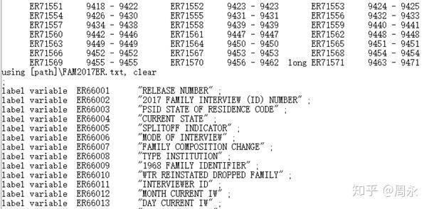 首先用记事本打开do文件,前边都是ER66001 - ER71571都是变量名的创建,往下拉,拉到变量标签的生成这个部分(label variable),可以看到中间有个导入FAM2017ER.txt文件的命令: