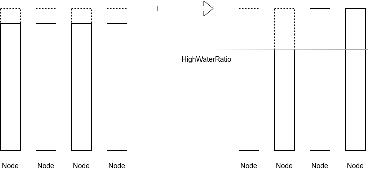 但在私有云场景下,我们发现当集群总体水位较满时,大量宿主机剩余一些碎片不能被分配出去,特别是一些大配置的Pod无法调度成功,但这些碎片如果合并起来,总体的量仍然相当可观。为了将这些“边角料”利用起来,我们修改了策略,引入一个集群整体资源水位的概念,用来切换打散策略和堆叠策略。