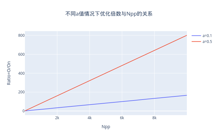 可以看出优化效果与Npp呈线性关系,同一个亲和组的Pod数越多,优化越明显。下面是a值在集群负载较轻和较满的时候,优化效果随Npp变化的图。
