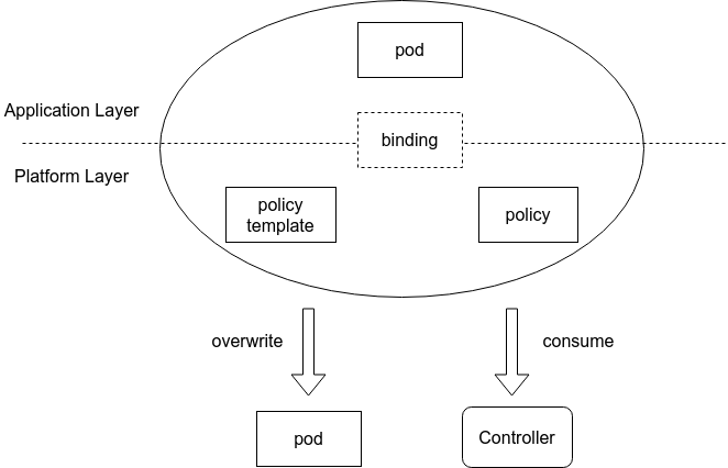 首先需要对共性需求进行整理,通过Configmap或者CRD抽象成Policy 。对于一些需要参数化的Policy,还可以通过模板机制创建一个中间抽象PolicyTemplate。 平台方或者业务方可以针对一类Pod创建Binding实例,指明需要绑定的Policy;或者绑定哪一个 PolicyTemplate,并在Binding对象实例中指明用来渲染模板的参数集。