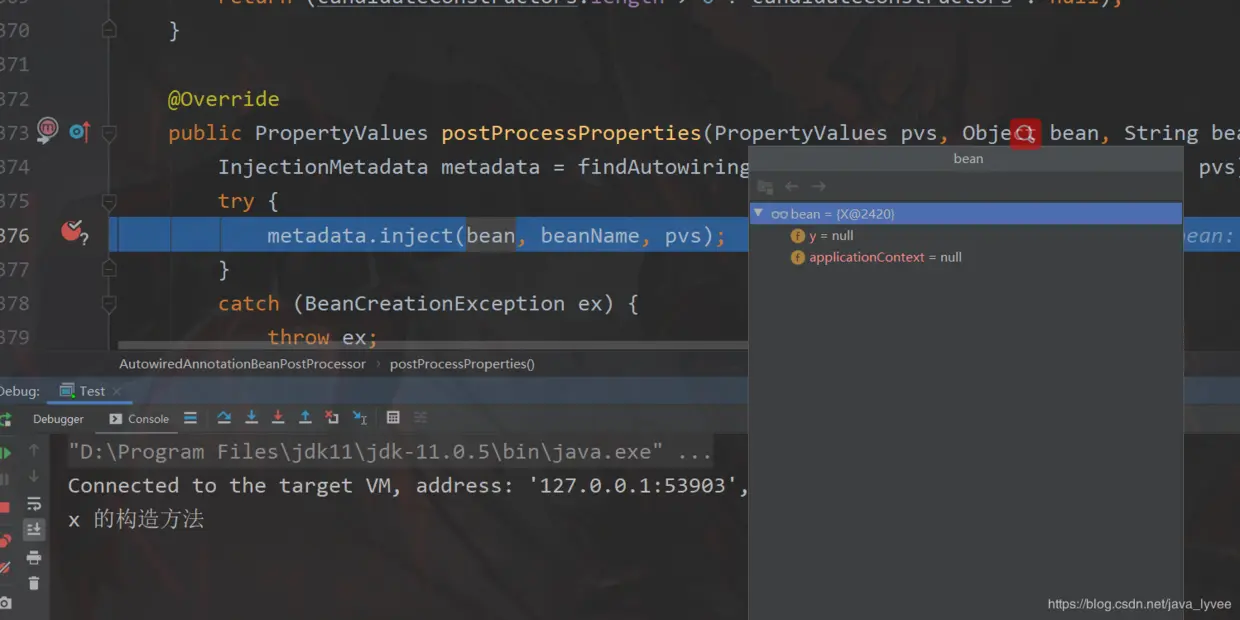 图上可以看到X已经实例化成对象了(还不是bean),但是里面的属性都是null,因为他才刚刚开始来填充属性;调用metadata.inject(bean, beanName, pvs);继续完成填充属性——debug it