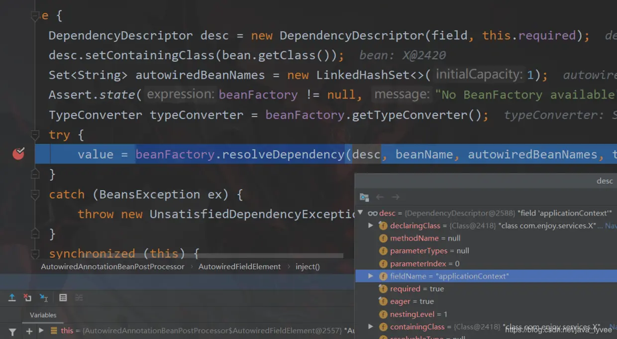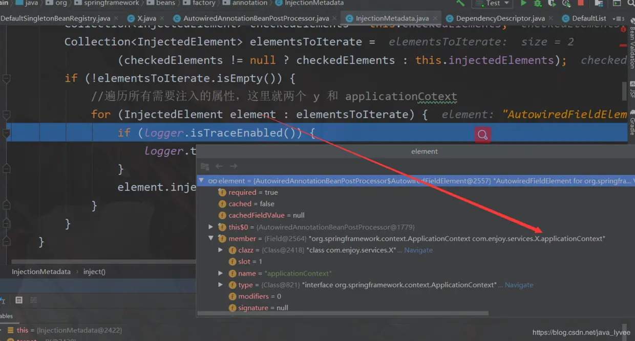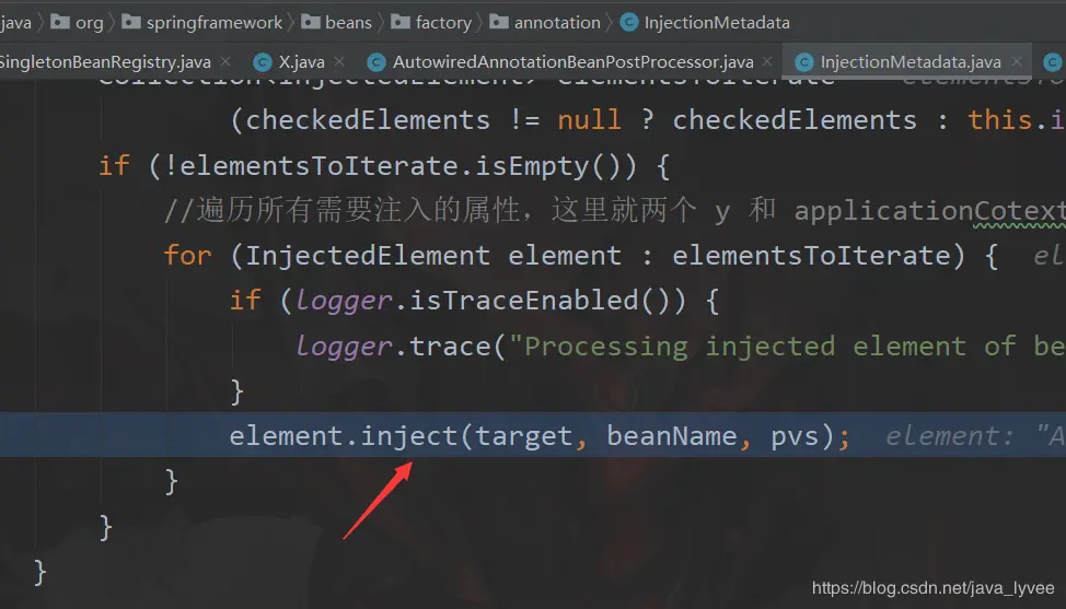 metadata.inject(bean, beanName, pvs);首先会遍历当前bean——当中所有需要注入的属性;也就是有两个Y 和 ApplicationContext;
