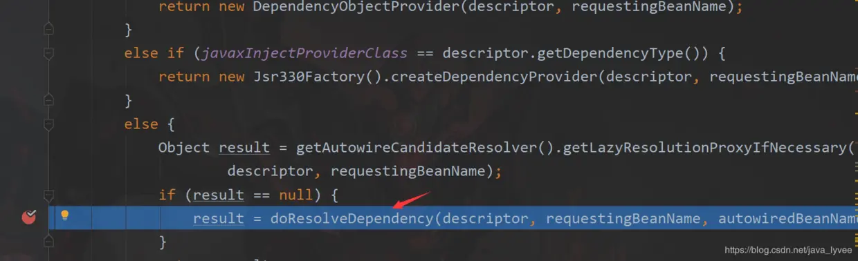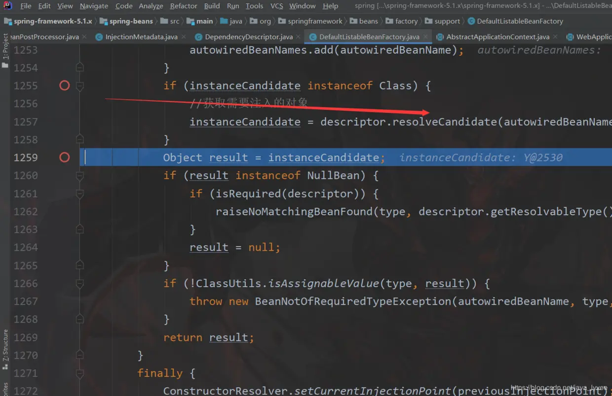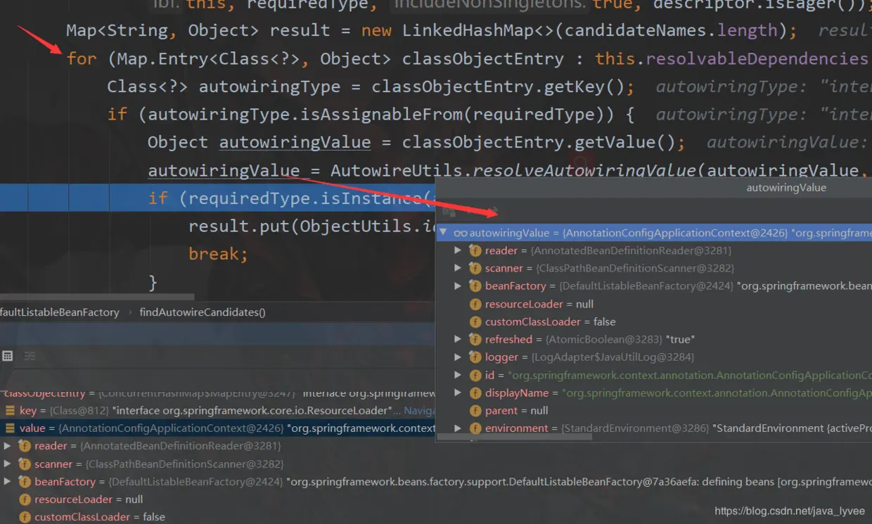 可以看到for循环已经进入,并且判断成功 autowiringValue已经有值了,进入if,break然后返回这个autowiringValue,完成属性注入;