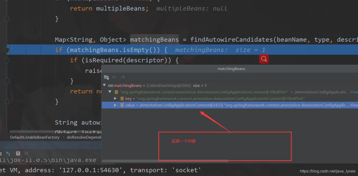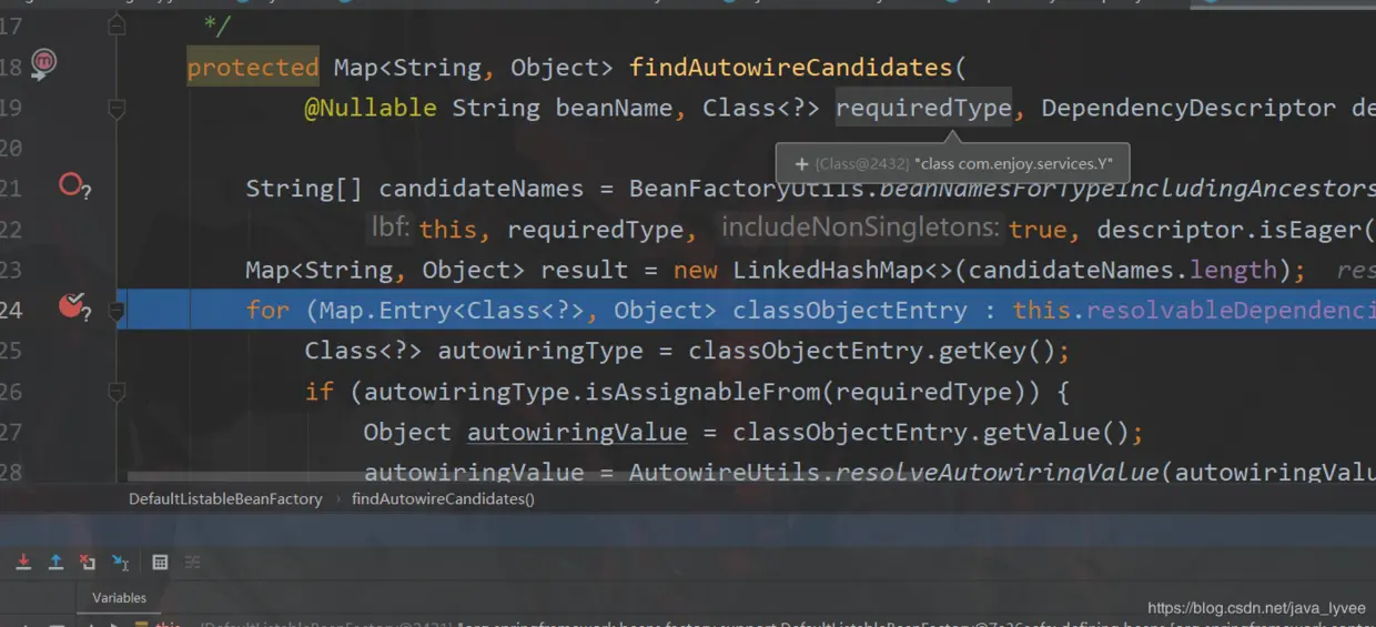 可以看到findAutowireCandidates已经执行完了,但是需要注入的属性y还只是一个class,不是对象;后台也只打印了x的构造方法没有打印y的;说穿了到到此为止y还是没有找到;