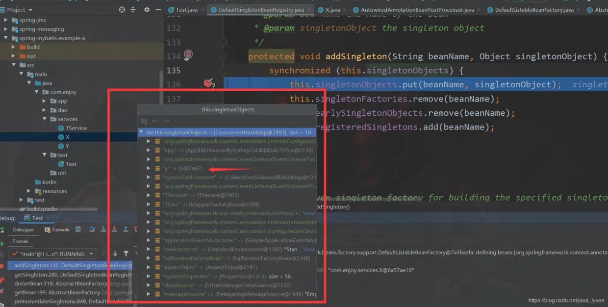 所以第一次for循环注入的是y;就是从单例池当中获取一下Y;如果获取不到就实例化Y放到单例池然后返回;反射填充属性Y;完成注入;