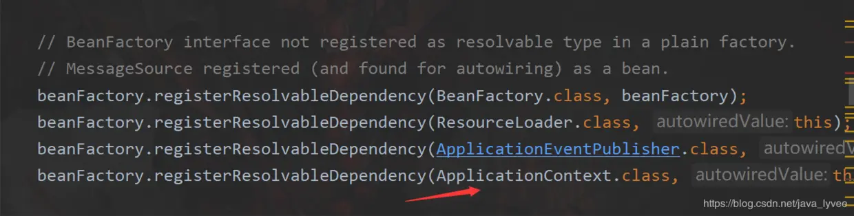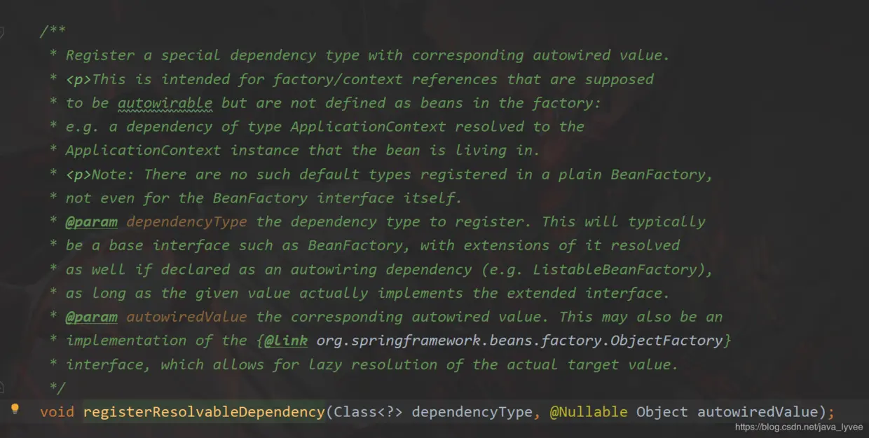 Register a special dependency type with corresponding autowired value 注册一个特殊的依赖类型——通用的注入的值 换句话说比如你有一些通用的对象、可能会被别的bean注入,那么你可以调用这个方法把这写对象放到一个map当中——resolvableDependencies 下面还有更加详细的说明,意思说spring当中的一些工厂或者上下文对象他们在bean工厂里面不是定义为bean,这个时候如果别的bean需要注入,则可以把他们放到这个map当中;