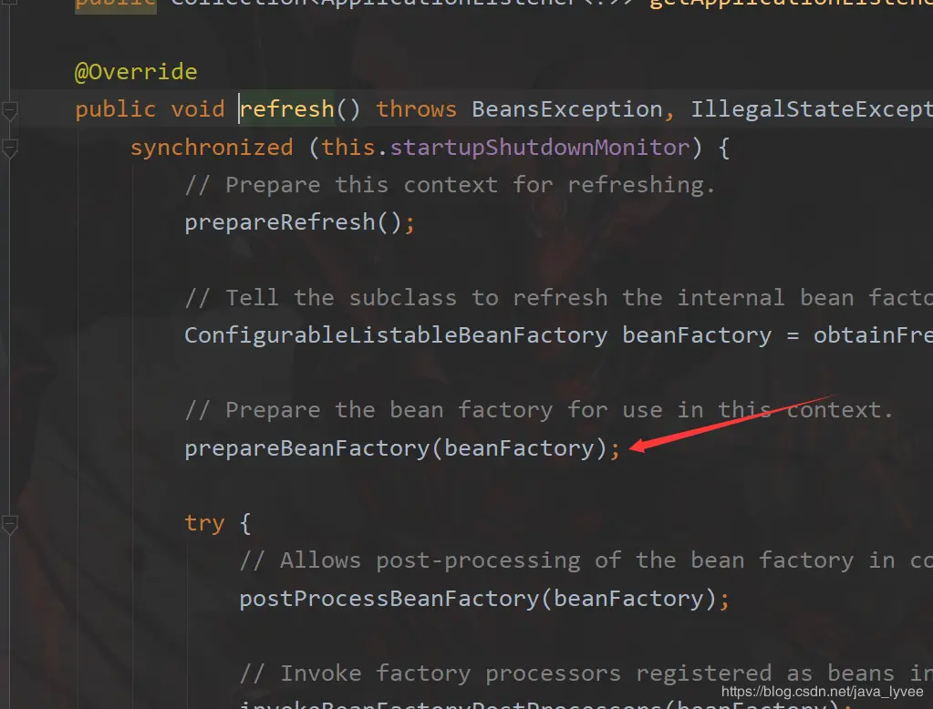 那么spring什么时候把这四个对象放到这个map当中的呢?——spring容器初始化的时候 我先把调用链列出来,然后在截几个图说明一下: 0、main方法 1、org.springframework.context.support.AbstractApplicationContext#refresh 2、org.springframework.context.support.AbstractApplicationContext#prepareBeanFactory 3、org.springframework.beans.factory.config.ConfigurableListableBeanFactory#registerResolvableDependency