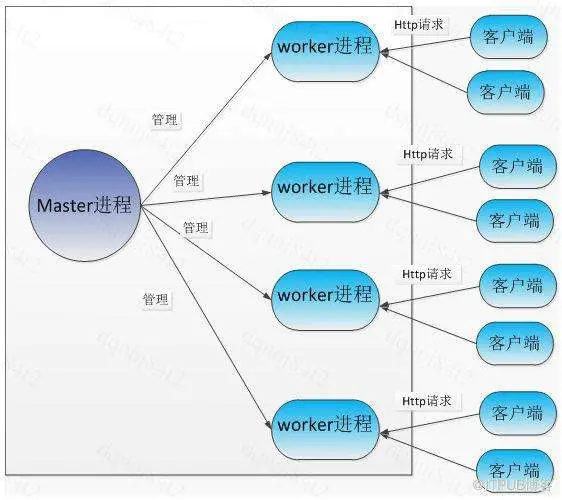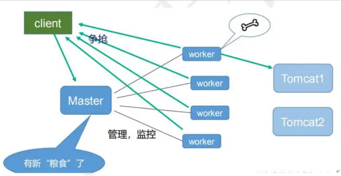 当 客户端发送了一个请求, 首先 进入的是 Master进程,而Master下面有多个worker进程, worker 的工作机制是 争抢, 哪个 worker 处理快,就会争抢到执行这个请求。
