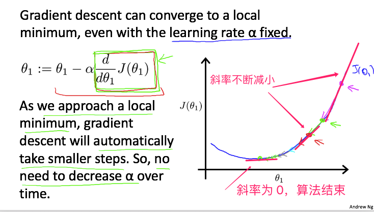 当算法最后迭代到最低点时,绿色点处斜率为 0,即梯度为 0,此时梯度下降公式将不再变化: