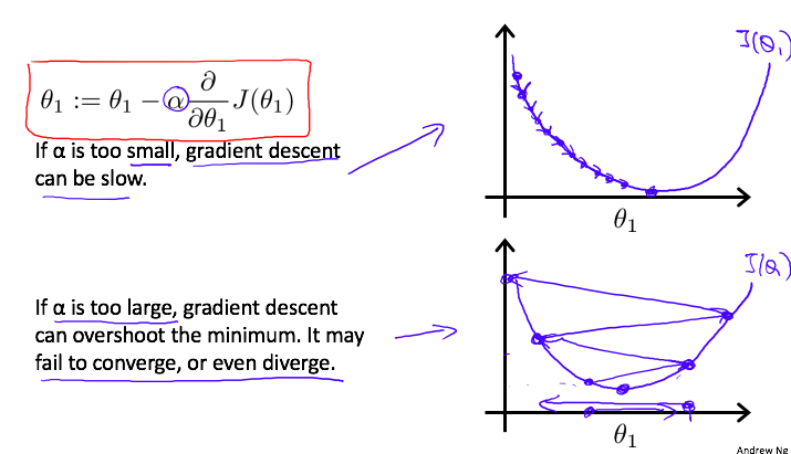 这里的 在算法中叫做学习率,虽然从名字上不好理解,不过它的作用就是控制算法每次迭代下降的步长,也就是每次下山打算迈开多大步。