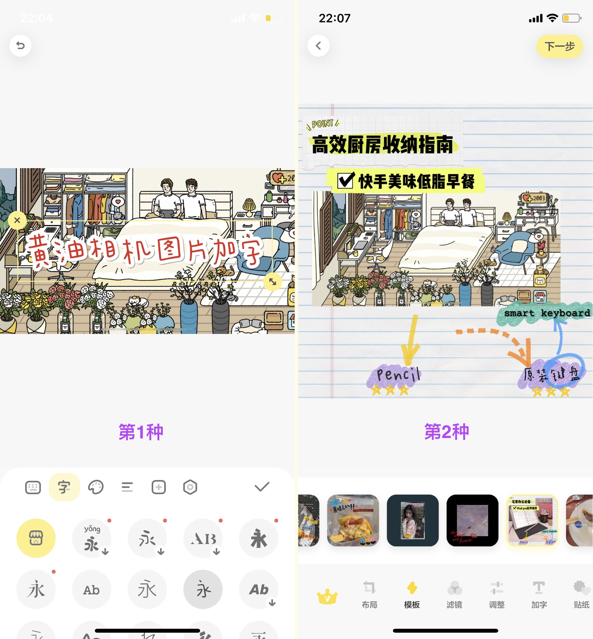 除此之外,在以图文为载体的内容生产过程中,常见“想快速分享文字但不知道用什么配图”、“自己本地存图不够好看”、“想把文字贴到图片上”等场景。为了满足以上场景需求,部分小且专注文字配图的app诞生,部分拍摄修图app新增文字贴纸的功能。