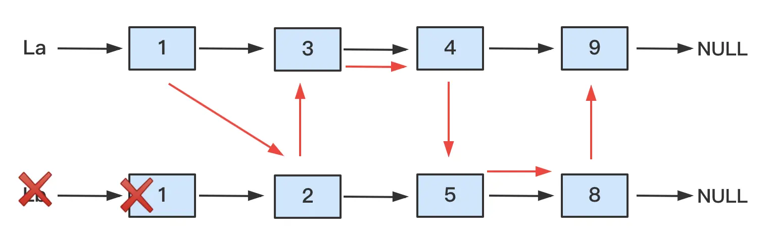 - 假设待合并的链表为La和Lb,合并后的新表使用头指针Lc(Lc的表头结点设为La的表头结点)指向. Pa 和 Pb 分别是La,Lb的工作指针.初始化为相应链表的首元结点