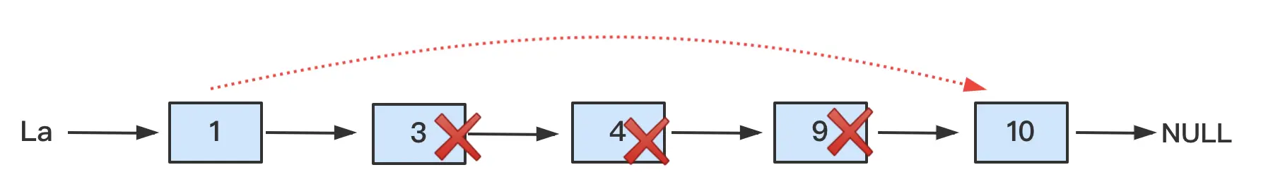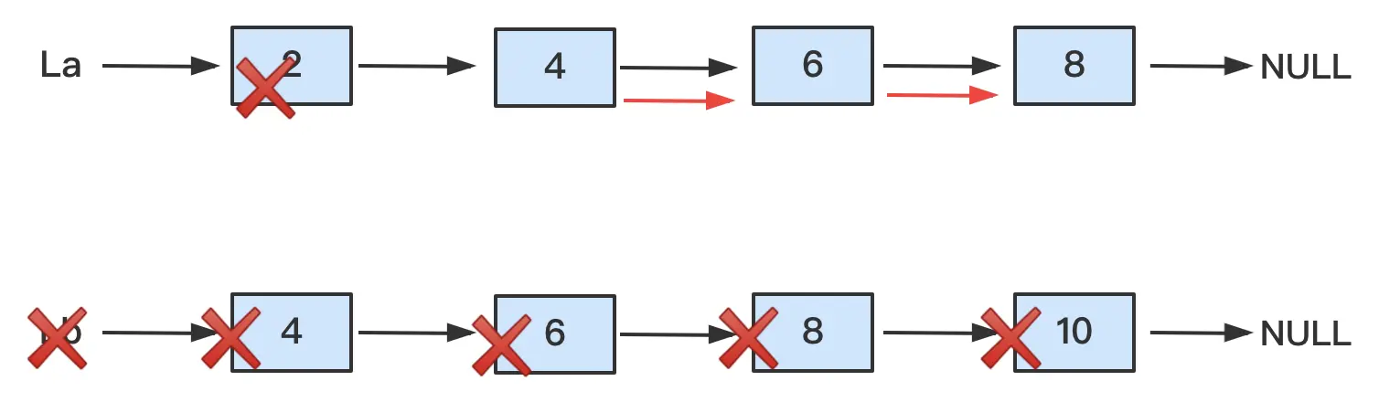 - 当链表La和Lb有一个先到达表尾结点为空时,依次删除另一个非空表中的所有元素