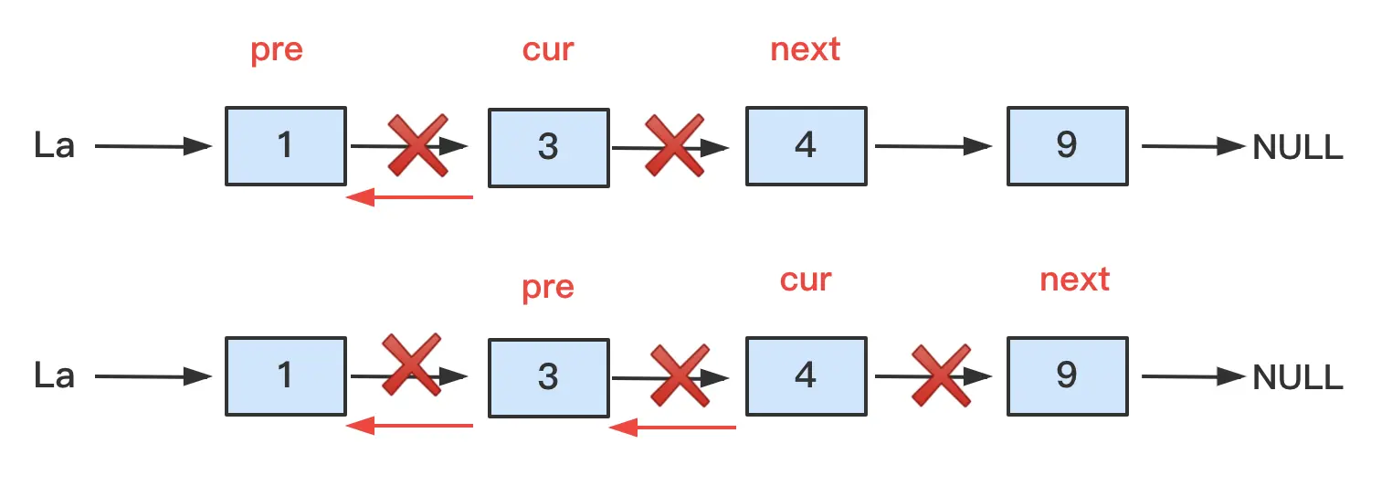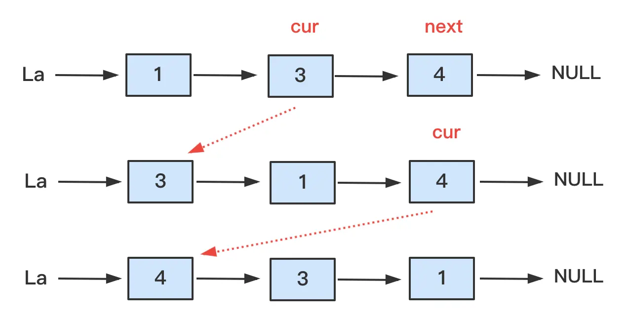 记录当前结点的后继结点后,翻转当前结点和它的前驱的顺序。