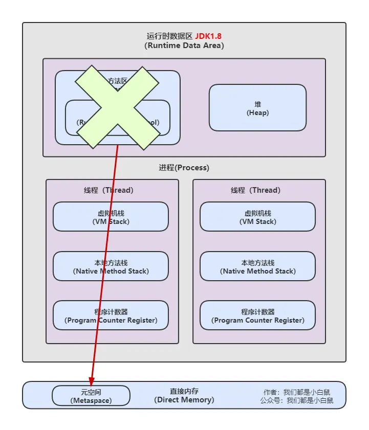 运行时数据区在 HotSpot 1.8 之前的版本和 1.8 版本有所不同,主要是 方法区移到元空间 了。