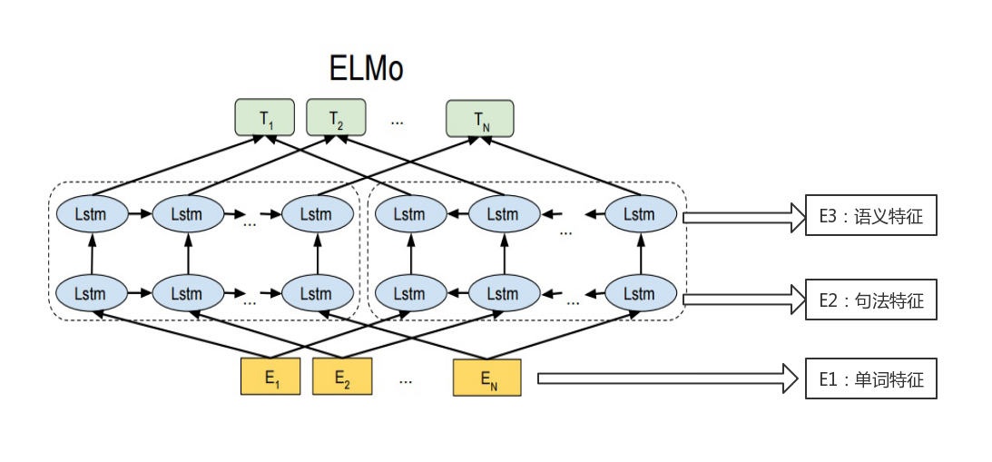 ELMO不仅使用词向量本身,还会通过图3中虚线的左右两个双层LSTM网络结构来学习语句中的句法特征和语义特征。最后拿词向量、句法特征向量和语义特征向量三个向量组合成一个理解了上下文的向量来最终表示这个词。