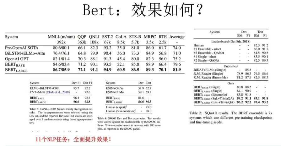 BERT集百家之长,同时使用了Transformer作为特征抽取器,还使用了上下文共同来表示词,所以是集大成者。而BERT的效果也是极其出色的。BERT在11个NLP任务重效果有很大的提升。