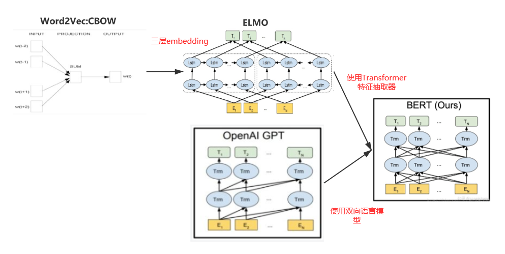来张全家图看看Word2Vec、ELMO、GPT和BERT的关系吧: