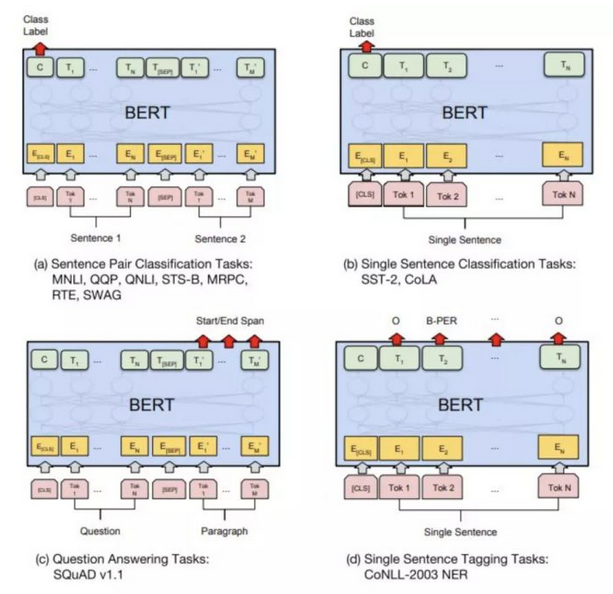 BERT同时支持特征补充和微调的方式来对接上游任务。一般选择微调的方式。之前说过,BERT不仅效果好,而且通用性很强。针对不同类型的NLP任务,如何改造BERT从而对接上游任务呢?