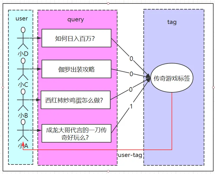 通过这四条搜索,我们人类可以很容易的识别小A的搜索和传奇游戏标签有关,所以我们会给小A打上传奇游戏兴趣标签。而另外三个人则和传奇游戏无关,不会打上传奇游戏的标签。