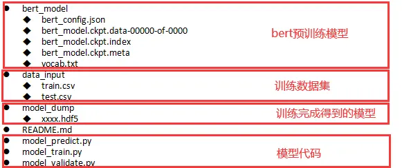 因为我们实际项目主要是识别用户中文搜索,所以选择BERT-Base, Chinese: BERT-Base, Chinese。下载完成之后解压,将文件中的五个部分copy到工程中bert_model目录下。