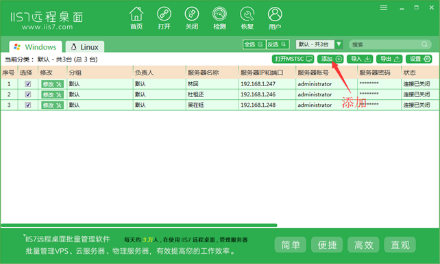 2.IIS7远程桌面 是专业vps管理服务器管理的工具,功能多样化,并且不断的改善,可批量管理 WIN系列服务器,VPS,电脑 。批量导入 服务器的IP,端口,账号和密码 。 批量打开N个服务器的远程桌面 。