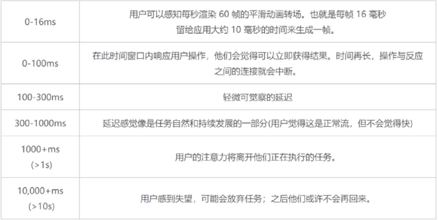 响应100ms内响应用户输入动画10ms一帧空闲时间空闲时间最大化加载5s呈现交互内容
