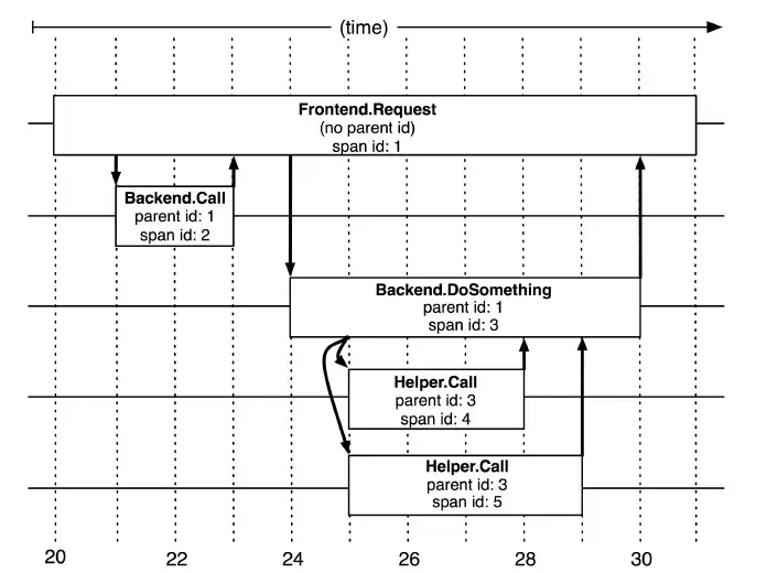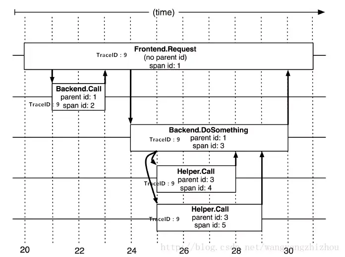 - 除了TraceID外,还需要SpanID用于记录调用父子关系。每个服务会记录下parent id和span id,通过他们可以组织一次完整调用链的父子关系。