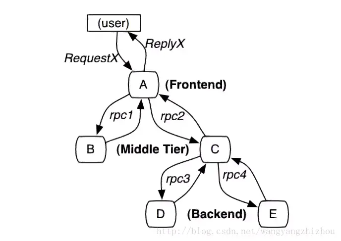- 当用户发起一个请求时,首先到达前端A服务,然后分别对B服务和C服务进行RPC调用;