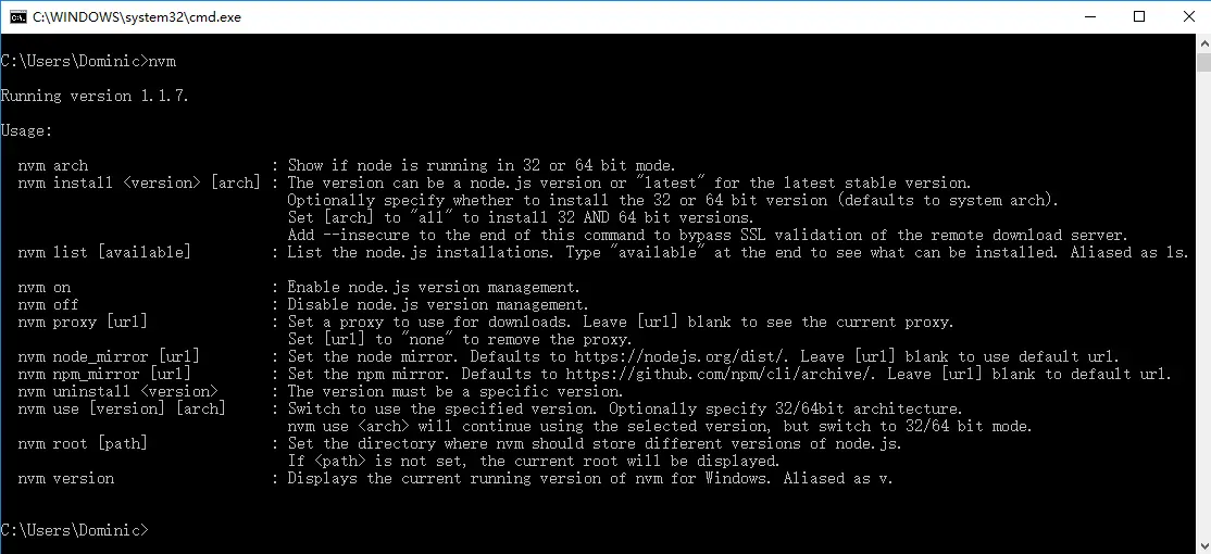打开CMD,输入命令 nvm ,安装成功则如下显示。可以看到里面列出了各种命令,本节最后会列出这些命令的中文示意。
