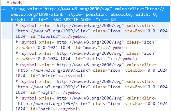 svg-sprite-loader会把你的svg塞到一个个symbol中,symbol的id如果不特别指定,就是你的文件名。它最终会在你的html中嵌入这样一个svg,一般插在body顶部