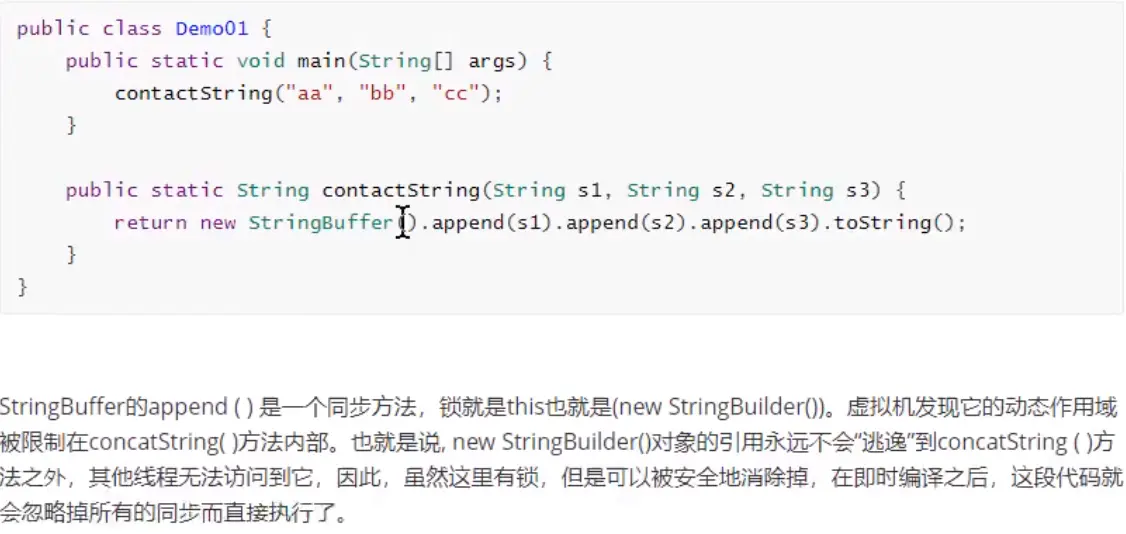 锁消除是指虚拟机即时编译器在运行时,对一些代码上要求同步,但是检测到不可能存在共享数据竞争的锁进行消除。如果判断一段代码中,堆上所有数据都不会逃逸出去从而被其他线程访问到,那就可以把他们当做堆上数据对待,认为他们是线程私有的,同步加锁自然就无需进行。