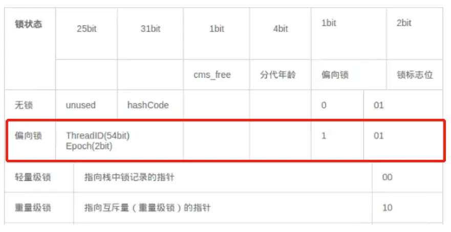 偏向锁会偏向于第一个获得它的线程,它会在对象头存储锁偏向的线程id,以后该线程进入和退出同步代码块时只需要检查是否为偏向锁、锁标志位、以及ThreadId即可。
