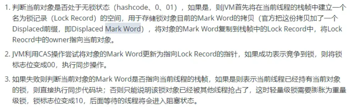 当锁对象第一次被线程获取的时候,虚拟机会把对象头中的标志位设为“01”,即偏向模式。同时使用CAS操作把获取到这个锁的线程ID记录在对象的Mark Word中,如果CAS操作成功,持有偏向锁的线程以后每次进入这个锁相关的同步块时,虚拟机都可以不再进行任何同步操作,偏向锁的效率高。