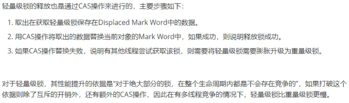 轻量级锁的目的:在多线程交替执行同步块的情况下,尽量避免重量级锁引起的性能消耗。但是如果多个线程在同一时刻进入临界区,会导致轻量级锁膨胀为重量级锁。