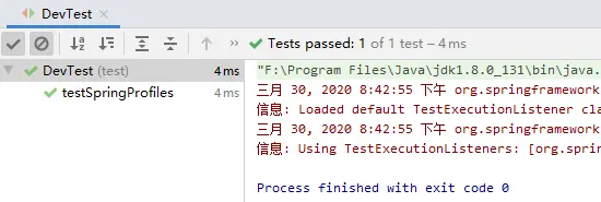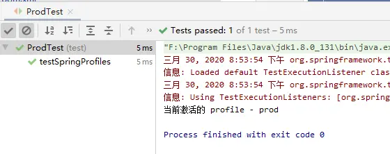 这次使用 @ActiveProfiles("prod") 注解指定当前环境为正式运行下的环境。本例中我们装配了一个新的 Bean environment,使用它的 getActiveProfiles() 方法可以获取当前激活的 Profile。程序运行的结果如下图所示: