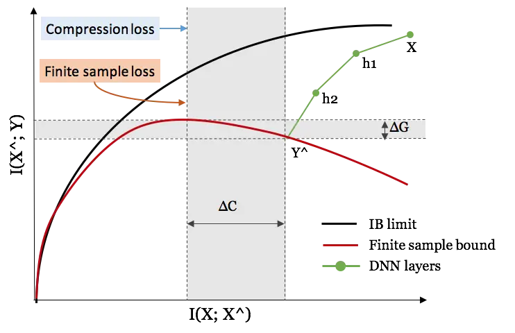 图5:黑线是可实现的最佳IB极限。在一个有限的样本集上训练时,红线对应样本外IB失真的上限。ΔC是复杂性的差距和ΔG是泛化的差距。