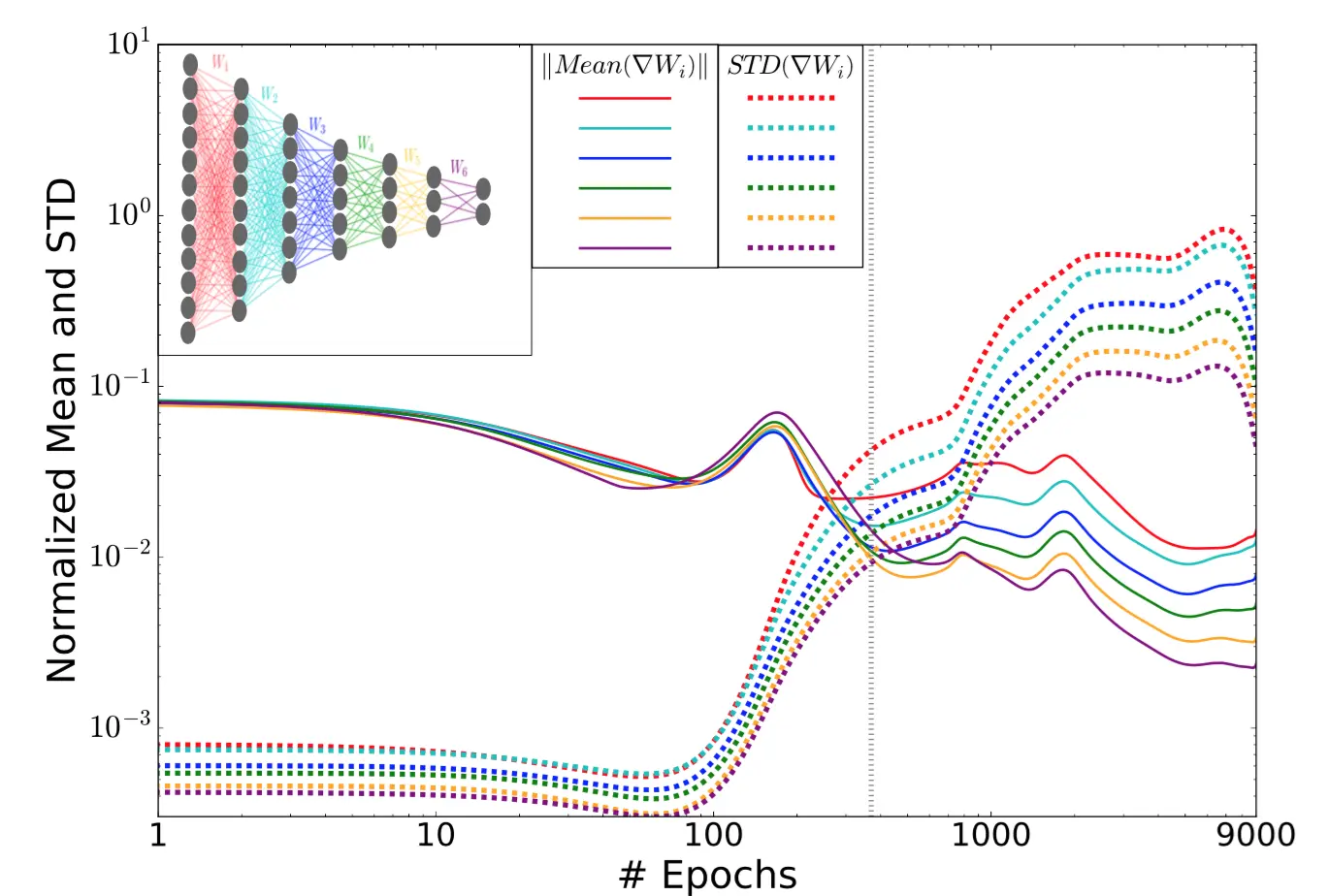在早期阶段中,平均值比标准差大三个量级。 经过足够的时间段后,误差趋于饱和,随后标准差变得更大。离输出越远的层,噪声就越大,这是因为噪声可以通过反向传播过程放大和累积(而不是由于层的宽度)。