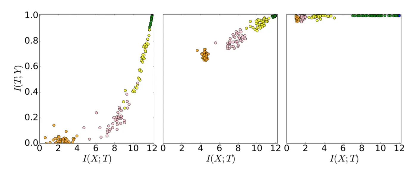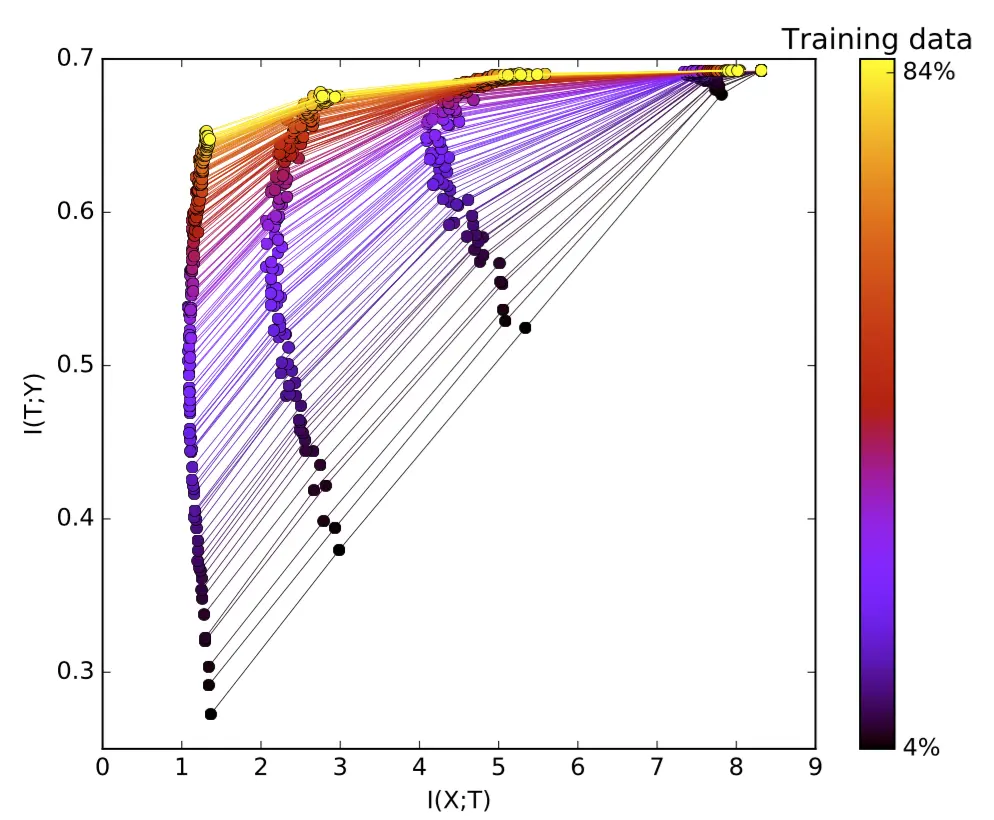 图7:不同大小的训练数据用不同颜色编码。这里绘制了多个聚合网络的信息平面。训练数据越多,泛化效果越好。