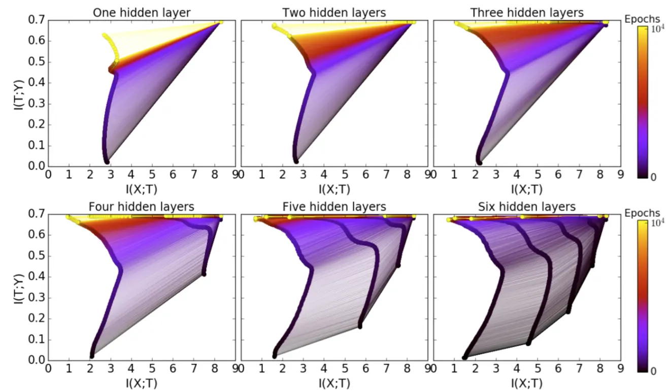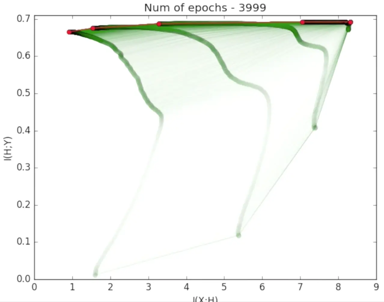 图2中的每个点表示一个隐含层的编码器或解码器的互信息(不采用正则化;没有权重衰减,没有丢失,等等)。它们按照预期的那样向上移动,因为关于真实标签的知识在增加(准确性在提高)。在早期阶段,隐藏层了解了很多关于输入的信息,但是之后它们开始压缩以忘记输入的一些信息。Tishby认为,“学习的最重要的部分实际上是遗忘”。