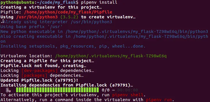 当需要在一个新的环境里运行程序时,只需要执行pipenv install 命令。Pipenv就会创建一个新的虚拟环境,并且自动从pipfile中读取依赖,并安装到新创建的虚拟环境中。