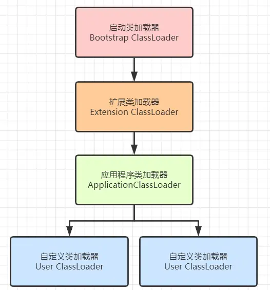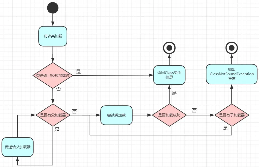 一个类加载器收到类加载的请求时,它不会马上加载该类,而是把这个请求委托给父加载器去完成,每一个层次的类加载器都是如此,因此所有的类加载请求都必须先通过启动类加载器尝试加载,只有当父加载器无法加载这个类时,才会把加载请求传递给它的子加载器去尝试加载,流程如下: