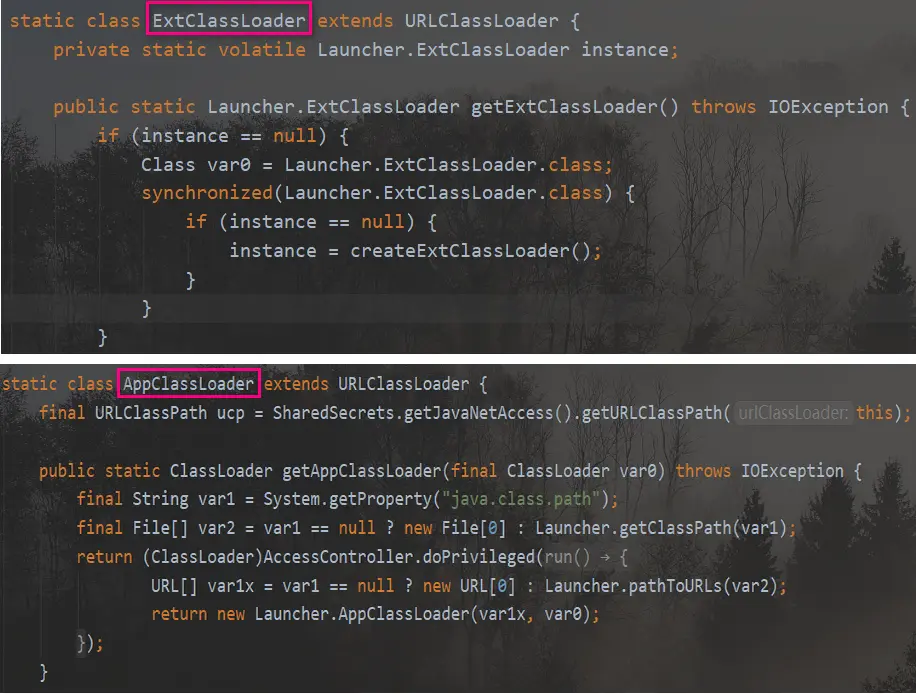 在Launcher类加载完成以后会对该类进行初始化,在初始化过程中会创建两个类加载器的实例,源码如下所示:
